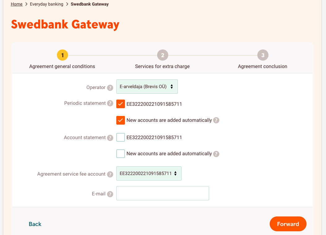 Choose a suitable "Agreement service fee account" and optionally fill in the "E-mail" field